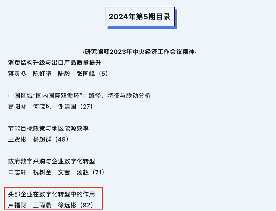 近日,我院卢福财教授与其指导的博士研究生王雨晨、博士徐远彬在我校权威期刊《数量经济技术经济研究》(2024年第5期),发表题为《头部企业在数字化转型中的作用》的论文。该论文为国家社会科学基金重大项目“数据要素驱动经济增长的理论与政策研究”(项目编号:23&ZD073)的阶段性研究成果。