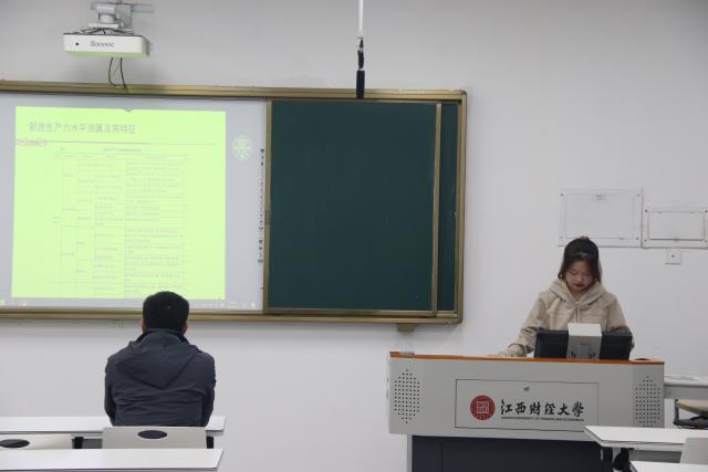 第二位进行文献分享的是丁雯静同学,她分享的文献选自《数量经济技术经济研究》2024年第6期,题为“新质生产力水平测算与中国经济增长新动能”。文章基于2012~2022年省级面板数据测算了中国新质生产力水平,并研究了其对经济增长的作用。研究发现,中国新质生产力水平快速增长,构成要素也稳步增长。地区间因经济基础、产业基础等差异,新质生产力发展水平不同。新质生产力通过优化要素配置和提高产业竞争力促进经济增长,有助于缩小区域经济增长差距。空间杜宾模型检验显示,新质生产力不仅直接促进经济增长,还具有显著的空间溢出效应。因此,政策建议包括提高创新要素供给质量和配置效率,加快发展战略性新兴产业和未来产业;打造区域增长极,发挥新质生产力溢出效应;因地制宜发展新质生产力。