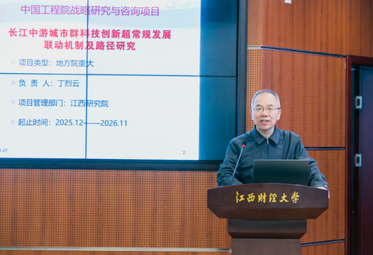 2026年1月21日,中国工程院院地合作重大咨询项目“长江中游城市群科技创新超常规发展联动机制及路径研究”启动会在江西财经大学召开。会议由中国工程科技发展战略江西研究院主办,江西财经大学、华中科技大学承办。中国工程院院士丁烈云、郑健龙,原江西省委常委、副省长朱虹,江西省政协人口资源环境委员会副主任杨斌,中国工程科技发展战略江西研究院副院长邹慧,江西财经大学党委书记刘耀彬,南昌高新区党工委书记陈艳,科技部战略规划司原一级调研员林涛,赣江新区创新发展局局长谢沐,江西铜业技术研究院总经理怀杨杨,江西省科技厅科技合作处副处长曾冰等领导专家出席会议。会议由项目负责人丁烈云院士主持。